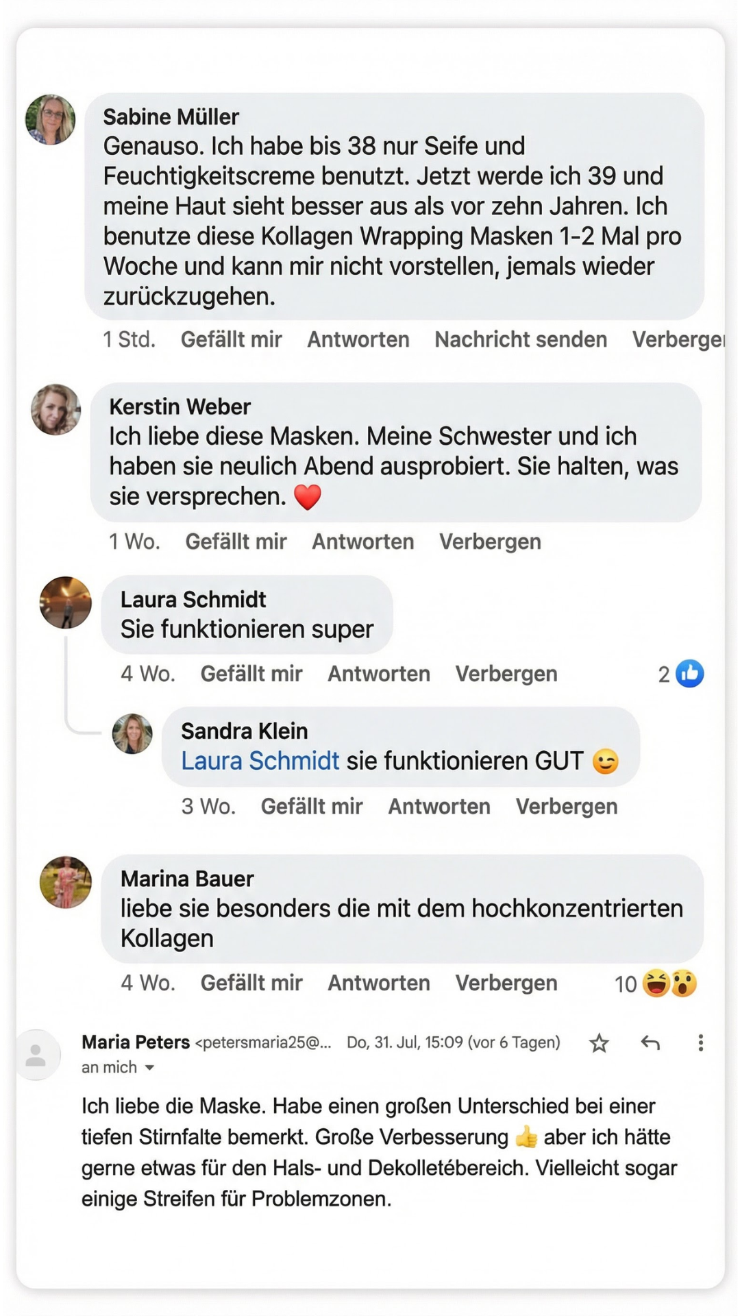 Die Kombination aus Kollagen, Glycerin und Hyaluron spendet Feuchtigkeit und lässt die Haut sichtbar praller erscheinen – Trockenheitslinien wirken softer.